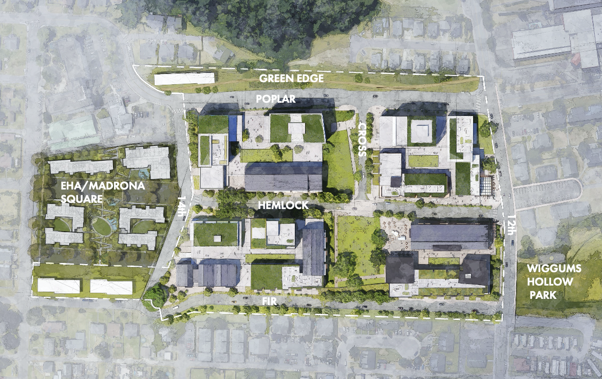 Framework led urban design for entitling 1,500 housing units on a 15-acre site in a phased development by the Everett Housing Authority (EHA). The project not only provides much needed housing, but to create a “heart” for the community by adding neighborhood retail, childcare, and civic uses that will serve the broader underserved Delta neighborhood. The Park District is centered on a 1.5 acre park, with a green connections to the adjacent elementary school, Boys and Girls Club, and Wiggums Hollow Park. The Everett City Council approved of a Preliminary Development Ordinance that included buildings up to 12 stories and non-residential uses. The project serves as a model for creating denser amenity-rich neighborhoods in the region. Framework’s scope included urban design, team coordination and representing EHA in public meetings and City presentations.