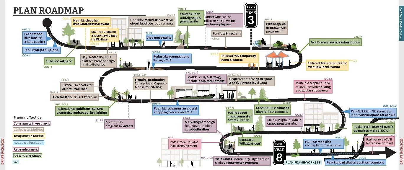 This masterplan focus on a new transit oriented development district in the City of Essex Junction, VT, a city about a 30 minute drive (and a 45 minute bus) from Burlington, VT. Vermont is currently in the process of creating it’s first set of affordable housing mandates in response to a severe housing shortage which is particularly acute in Chittenden County (the home of Essex Junction). The masterplan works in concert with housing goals by pro-actively allow more housing, while providing a road map for strategic community public realm investments to increase walkability, and public space. Plan actions span from municipal code updates (in progress), to community capacity building efforts, to temporary activations to test new road alignments.