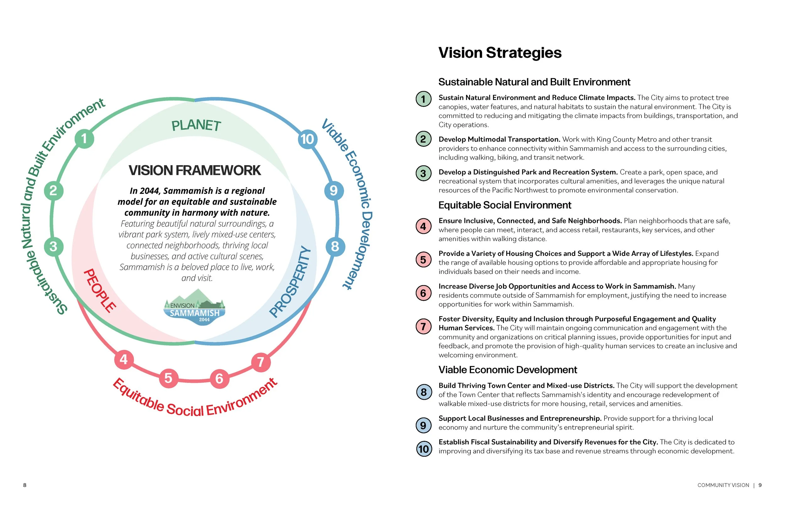 Plan highlights include a refreshed future land use map with adequate capacity for new jobs and homes that can serve a variety of incomes, a racially disparate impact analysis for housing, and a new climate change and resiliency element. A new economic development element emphasizes local business creation and walkable, people-centered placemaking for the City’s fiscal sustainability. Futurewise, a Washington-based organization that works with communities to plan a just, sustainable future, recognized Envision Sammamish 2044 with their “Livable Communities Award.”